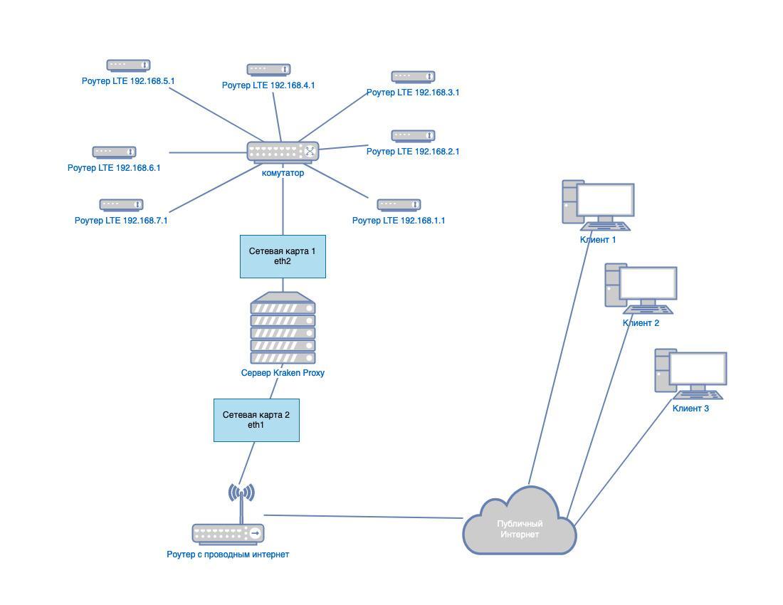 Все перечисленные модемы в связке с Keenetic позволяют организовать более стабильную работу прокси фермы, так как имеют отдельный usb порт и передача данным между сервером и модемом производится через сетевое подключение, что обеспечивают более стабильную работу сервера и уменьшает нагрузку на него. Также неоспоримым дополнением является возможность управления питанием модема через usb порт Keenetic. Начиная с версии «kraken proxy - 2.1.2» была добавлена возможность перезагружать usb модем отключением питания usb порта, если ping модема отсутствует (модем завис). Либо производить смену IP, если другие способы не позволяют этого сделать у вашего провайдера мобильного интернета. Сам роутер подключаемый к серверу имеет отдельный Macvlan интерфейс - сетевой драйвер, который позволяет роутеру иметь уникальные MAC-адреса и быть видимым в физической сети как отдельное устройство. Основным достоинством такого подхода является значительное повышение производительность, за счет снижения необходимость в пересылке трафика через хостовый интерфейс.