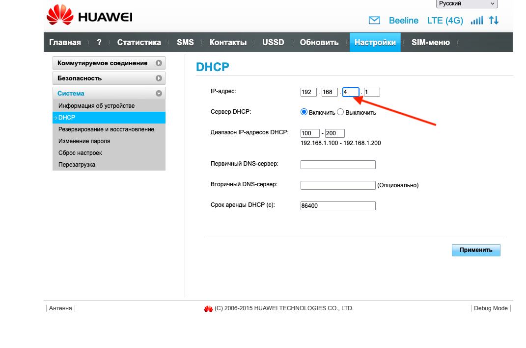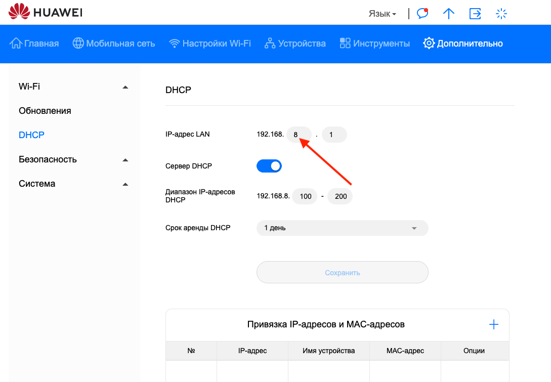 Установим подсеть по адресу Дополнитель->DHCP (url адрес по умолчанию http://192.168.8.1/html/content.html#dhcp), аналогично как для модели Huawei E3372h-153