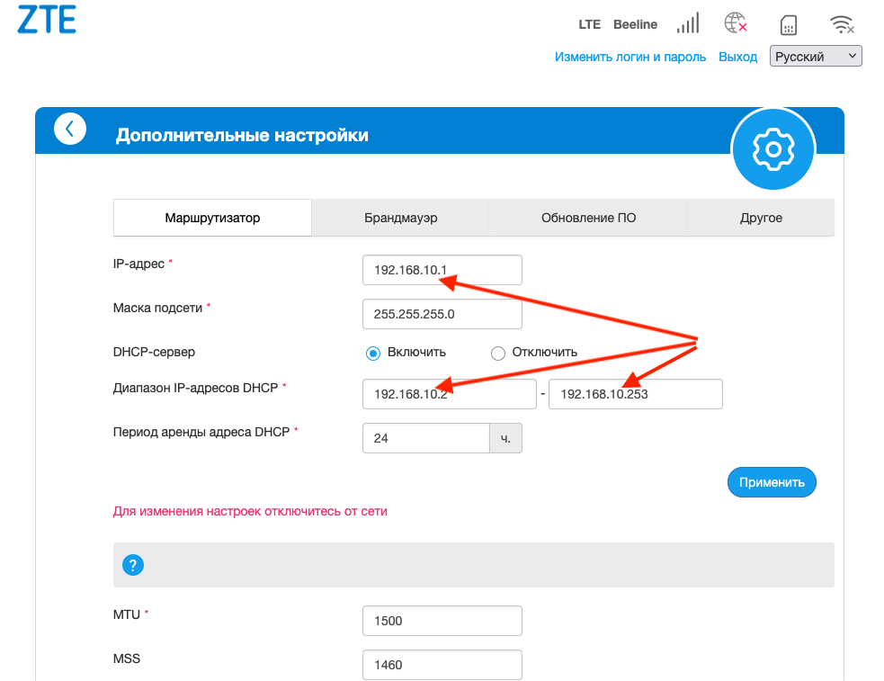 Первым шагом лучше всего произвести настройку usb модема, подключаемого к роутеру. Для каждой модели модема имеются свои особенности настройки, так и общие. Общим будет — это изменение посети DHCP сервера модема, чтобы исключить сетевой конфликт между разными роутерами и модемами (каждая подсеть должна быть уникальная).