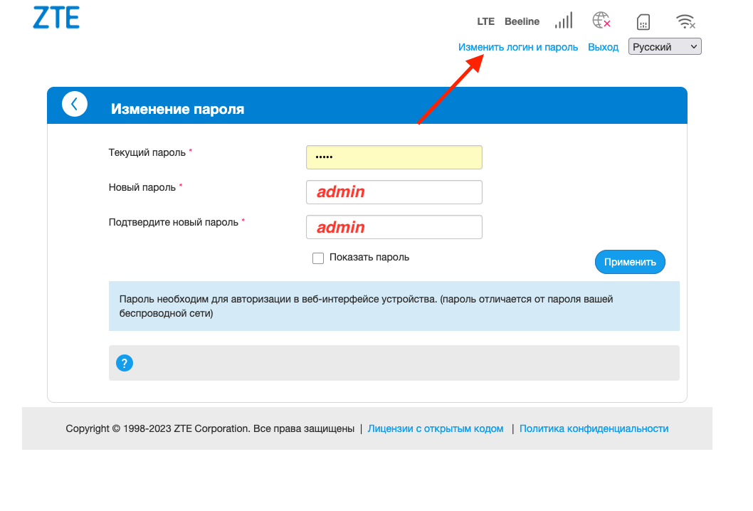 Модем ZTE MF79U имеет авторизацию, поэтому, как и для Huawei E8372h-320 нам по мимо смены подсети требуется настроить пароль.