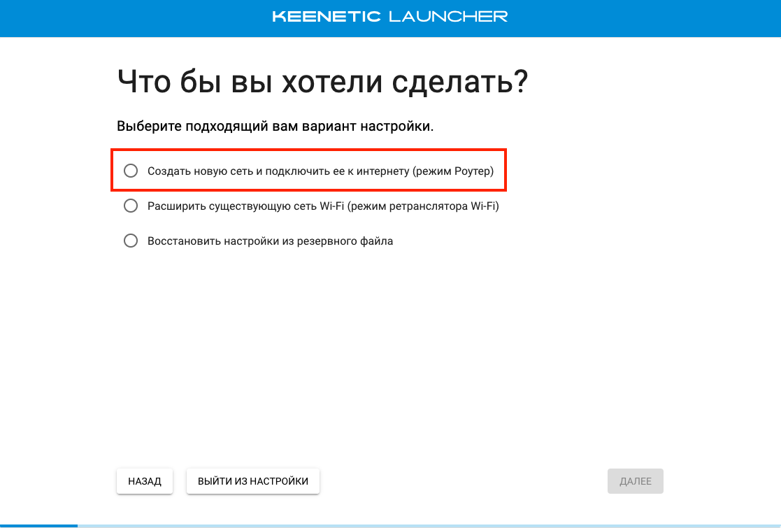 Если у вас нет доступа к интернет через usb, можете вернуться «Назад» на шаг выбора режима работы роутера и нажать на кнопку «Выйти из настроек».
