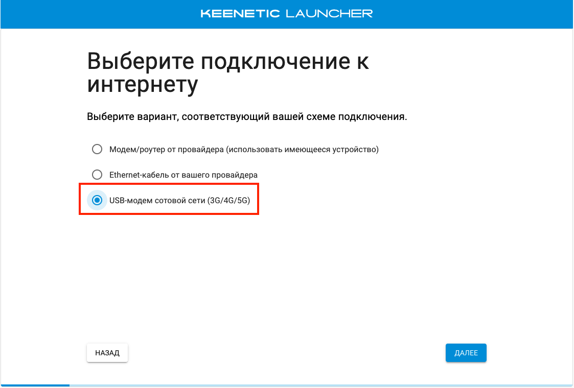 Далее мастер попросит указать подключение к интернет, которое будет использовать как основное, выбираем «USB-модем сотовой сети (3G/4G/5G)»