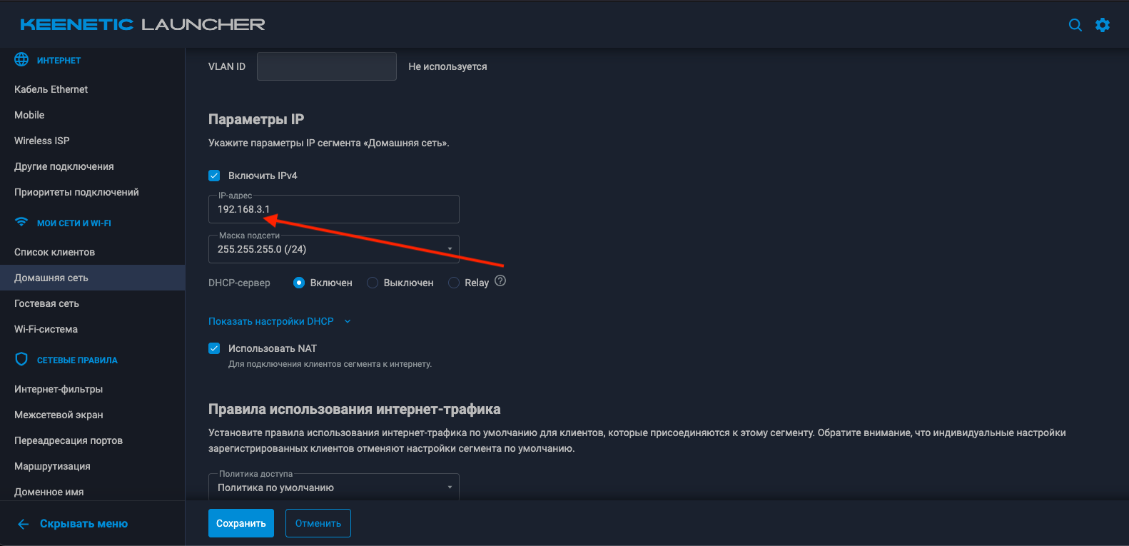 Следующим этапом следует настроить подсеть самого роутера для предотвращения сетевого конфликта в соответствии со схемой подключения. Перейдем в раздел «Мои сети и WIFI->Домашняя сеть». Изменим «Параметры IP» на уникальные.