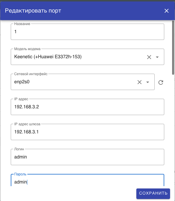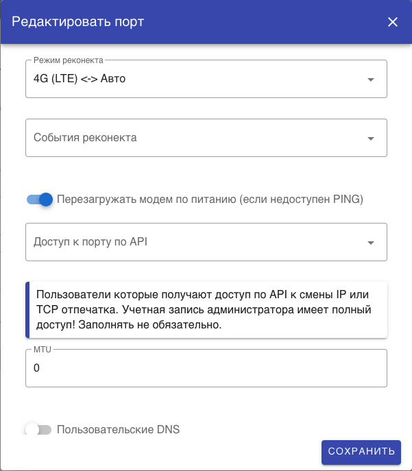 Доступ порту по API (необязательно) – в этом поле выбираем пользователей, которые будут иметь доступ к модему как через панель, так и по REST API. Пользователь создаете в разделе «Пользователи»